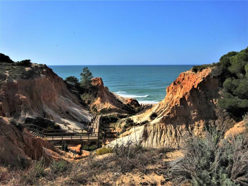 Weer een wandeling vandaag, nu naar de erg luxe havenplaats Villamoura. Weer een stralende dag met behoorlijk veel wind. We slenteren door de grote haven met talloze dure restaurants en dito winkels. Even buiten de haven zien we een terras waar Portugezen zitten. Daar is de koffie nog betaalbaar; en lekker. Terug bij de camper gaan de stoelen in de ruststand. Uit de wind en in de zon is het erg warm. Aan het einde van de middag gaan we nog een keer wandelen, nu naar Falesia. Eigenlijk te warm en we zijn blij dat we halverwege bij kunnen komen op een terras.
