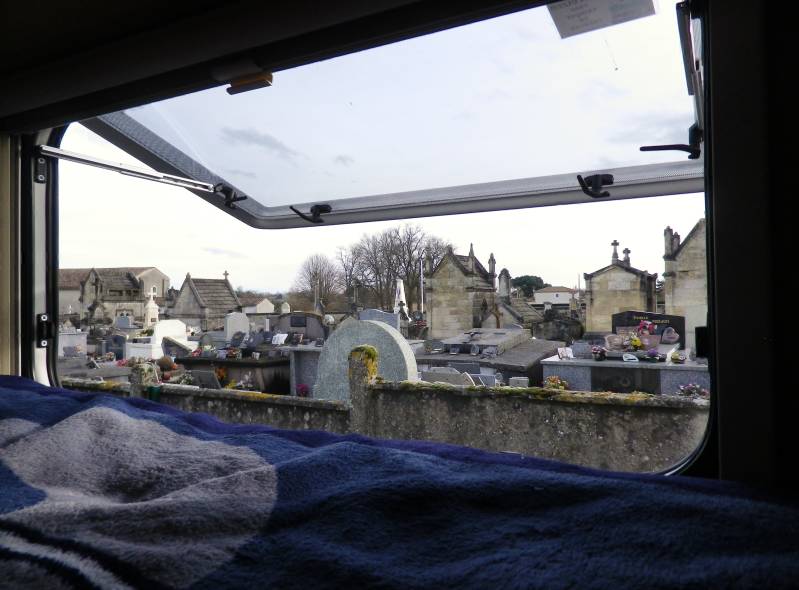 We gaan verder richting Bordeaux, via Vierzon en Angoulême, Soms vierbaans, dan weer tweebaans, soms druk, dan weer erg rustig. Tot voor in de avond blijft het prachtig weer; de vorst is hier verdwenen. We stoppen in de plaats Cavignac, vijftig kilometer voor Bordeaux. De camperplek ligt achter het kerkhof en is dus erg rustig. Voor ons drie andere campers en naast ons de muur van het oude kerkhof. Het enige geluid is dat van de wind en de regen.