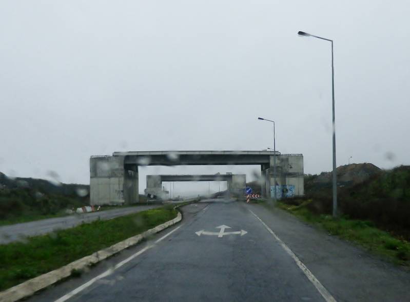 Na een stille nacht, helemaal alleen op een eenzame heuvel, zit de wereld 's ochtends potdicht. Van het enige aardige aan deze camperplek, een ruim uitzicht op de omgeving, blijft dus ook al niets over. We gaan naar de kust, naar Tavira. Na een rit door ook al een eenzaam gebied, met veel onafgebouwde viaducten en veel regen onderweg, zoeken we een camperplek op met alle voorzieningen, die we nog niet denken te kennen. Bij aankomst blijkt het een camping te zijn, waar we vorig jaar ook al eens gestaan hebben. En omdat het blijft regenen en waaien, blijven we een nacht. Overigens staat het hier behoorlijk vol met overwinteraars. Maar die zitten nu ook allemaal binnen. In de loop van de middag gaan we naar het grote overdekte winkelcentrum in Tavira. Alle winkels zijn open, het is er droog, warm en gezellig druk. En lekkere , goedkope koffie en gratis internet.