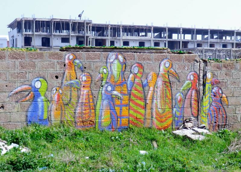 We zijn erg actief geweest vandaag. Daar waar we gisteren linksaf over de boulevard gewandeld hebben, zijn we vandaag rechtsaf geslagen. Langs de af en toe moeilijk begaanbare rotskust kom je een eindeloze rij van oorsprong rotswoningen tegen. Tegenwoordig onderkomens van vissers; veelal bizarre bouwsels en soms nog amper bereikbaar en er is vrijwel geen visser te bekennen. Het is zwaar bewolkt en mede daardoor maakt het geheel een sombere indruk. In de middag zijn we met de lijnbus naar Tiznit geweest. Met z'n drieën, Marinus had al gefietst en moest op Max passen. Talloze winkeltjes en zaakjes in Tiznit, waar van alles te koop is. We blijven ons verbazen over de slagers. Alles wat aan of in een koe en geit heeft gezeten, ligt of hangt uitgestald en is te koop. Je kunt ruiken wanneer je bij een slager in de buurt komt. Wij houden het bij groente en fruit. Inmiddels is ook de zon tevoorschijn gekomen. De koffie op een terras smaakt daardoor extra lekker.