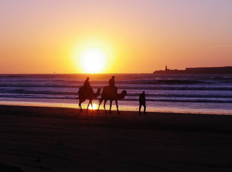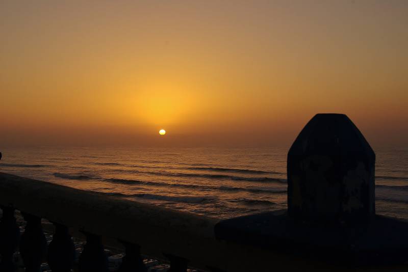 We willen alsnog naar Essaouira en besluiten terug te rijden. We parkeren de campers op de grote parking bij de vuurtoren en de gehalveerde camping. Achter ons een duinenrij, dus denken we beschut te staan voor de wind. De stoelen gaan naar buiten, de zon schijnt volop, maar dat blijkt iets te enthousiast. Door een vreemde werveling van de wind krijgen we regelmatig een zandvlaag over ons heen. Ook de campers, waarvan we de dakluiken hadden opengezet. Na de middag wandelen we naar de haven en het centrum. In de haven gaan we vis eten. Er zitten zo'n twintig "openluchteettentjes" bij elkaar. Daar kun je vijf á zes soorten vis eten voor een min of meer vaste prijs. We hebben niet alles herkend wat we gegeten hebben. En natafelen was er niet bij; bord leeg betekent weg bord en wordt de tafel alvast schoongeveegd en gedekt voor de volgende gasten. Het oude, ommuurde winkelcentrum van Essaouira, de medina, is groot en druk met talloze winkeltjes met van alles en nog wat. Hoeven we niet elke dag naar toe. Tot slot van de dag zien we de zon in de zee zakken, en dat is voor het eerst deze reis.