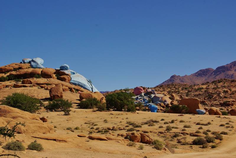 Twee dagen genieten hier in Tafraout. Prachtig weer, heerlijk warm en een geweldige omgeving. Veel wandelen en veel te veel foto's gemaakt. Tussendoor is Wim nog naar de kapper geweest. Een Marokkaanse coupe voor drie euro. En we maken kennis met Co en Lia Keizer. Hun namen kennen we van het Camperforum en we volgen hun reizen op hun website; met erg mooie foto's. Altijd leuk om reiservaringen uit te wisselen. Op woensdag gaan we eerst naar de markt voor groente en eieren. Bij een groentekraam pak je een plastic bak, vult die met alles wat je nodig hebt en wordt dan gewogen. Vervolgens betaal je per kilo groente. Al met al een grote markt, met van alles te koop en veel te zien. In de middag zijn we een paar uur op de fiets weggeweest en hebben wat van de omgeving verkend. De bizarre rotsformaties blijven fascineren. Via Co Keizer horen we dat we op een camping hier vlakbij kunnen douchen. Kost een euro per persoon en we hebben er dankbaar gebruik van gemaakt.