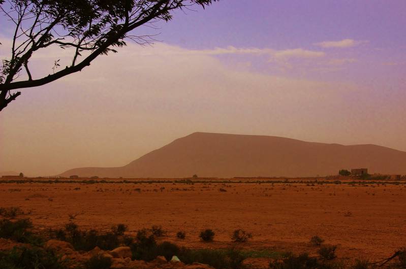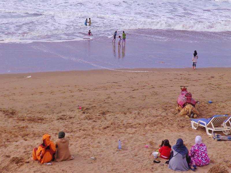 Na een erg warme nacht is het weer vroeg dag. Het thermobad is erg vroeg open en het is een gaan en komen van badgasten. Het is bewolkt en het waait enorm. We besluiten om terug te gaan naar de kust en trekken honderdzestig kilometer naar het noorden. In Guelmim willen we naar de kamelenmarkt, zoals beschreven in onze Marokkogids. We rijden drie keer rond en door de plaats, maar komen geen kameel tegen, laar staan een markt. Voor de volgende reis hebben we echt een nieuwe gids nodig. Tijdens de hele tocht blijft het waaien. Boven de enorme vlaktes, vooral in het begin, is de lucht bruin van het zand en stof. In Tiznit maken we een tussenstop voor wat noodzakelijke boodschappen. De camping die we uitgezocht hebben, ligt pal aan zee, heet Sidi Wassay Beach en ligt vijfenvijftig kilometer ten zuiden van Agadir. Het is er rustig en mooie plaatsen te over. We kiezen voor de beschutting van een muur. En ondanks de wind en twee keer wat regendruppels is het 's avonds om elf uur nog dertig graden.