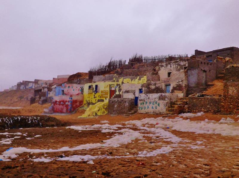 Het weer laat ons in de steek. De temperatuur ligt wel tien graden lager dan gisteren en de zon zien we weinig. In de ochtend valt het nog mee. Tijd voor een pittige wandeling langs de zee. Na ruim een uur komen we bij een aantal grotwoningen waar vissers huizen. En een prachtig hotelcomplex. Na wat vriendelijk aandringen kunnen we er koffie krijgen. Lekkere koffie, maar duur voor Marokkaanse begrippen: twee keer € 1,50. Voor in de middag zijn we terug en rommelen wat in en rond de camper. En we helpen Marinus bij het provisorisch repareren van zijn fietsdrager achterop de camper. Eén van de goten is verbogen: geen idee wanneer en door wie. Nogal mysterieus.