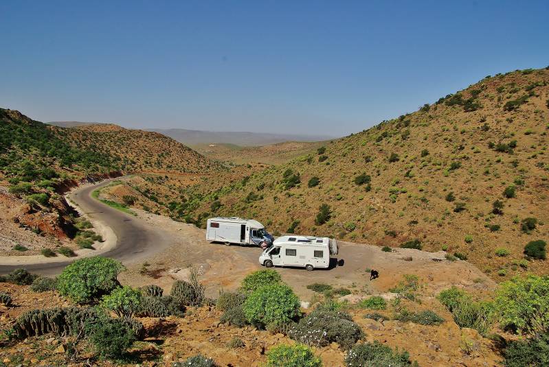 Een echte rustdag. We tutten wat in en rond de camper, wat lezen, computeren enzovoort. Aan het einde van de middag gaan we met z'n vieren het dorp in. Het is er druk. In een tentencomplex wordt een soort beurs gehouden waar tal van producten uit de streek gekocht kunnen worden: honing, olie, zalfjes, kruiden, sierraden enzovoort. Uiteindelijk belanden we op een terras van een restaurant waar we heerlijk eten en een mooi uitzicht hebben op vooral Marokkaanse dames die in hun mooiste outfit voorbij flaneren. De zaterdag verloopt eveneens rustig. Zij het dat er regelmatig achter ons geknald wordt. Dat komt van een wedstrijd kleiduivenschieten. We hebben nooit geweten dat die hier rondvlogen.