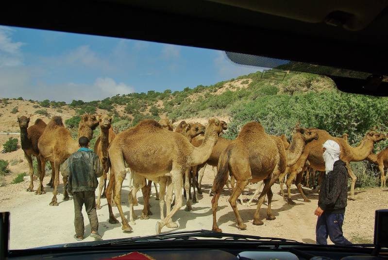 Als we opstaan is het bewolkt en fris. We hadden gisteren al besloten dat als we niet met een zonnetje wakker zouden worden, we weer een stukje naar het noorden zouden reizen. Via via hebben we coördinaten van een camping vijfentwintig kilometer ten noorden van Agadir bemachtigd. Na wat boodschappen te hebben gedaan bij de Marjane supermarkt in Agadir, rijden we naar camping "Terre d'Ocean" bij het dorp Taghazout. Deze ligt een paar honderd meter van de kustweg af, halverwege een bergwand. Even voor de ingang kunnen we niet verder. Een enorme kudde dromedarissen heeft de weg in beslag genomen. Twee mannen proberen enige orde in de chaos te scheppen, hetgeen met de nodige moeite enigszins lukt. Het lijken erg eigenwijze beesten te zijn. De camping ligt prachtig tegen de berghelling geplakt, honderd meter boven de zeespiegel. We hebben een geweldig uitzicht. En, niet onbelangrijk, de zon schijnt hier volop.