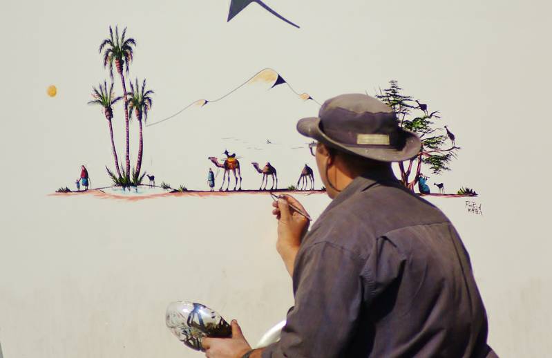 Al vroeg in de ochtend staat er een visser voor de deur met een kist vol verse vis. We kiezen er vier. Na het gebruikelijke afdingen betalen we vier euro. Ter plekke schoongemaakt en ontdaan van alles wat volgens ons niet eetbaar is. Vervolgens hebben we weer een prachtige wandeling gemaakt. Foto's gemaakt van nomadententen en vrouwen en kinderen die op een vuilnisbelt naar bruikbare spullen zoeken. Omringd door geiten en schapen die ijverig meezoeken. We hebben het idee dat de vuilnis hier drie keer nageplozen wordt. Als we terug zijn blijkt er geen geheugenkaart in het fototoestel te zitten; geen foto's dus. Aan het einde van de middag hebben we weer met verbazing gekeken naar een schilder die weer een fraai kunstwerk op een camper fabriceert. Daarna met Marinus en Catrien afgesproken dat we morgen eerst naar Marrakech gaan en daarna naar Ouzoud, naar de beroemde watervallen daar. En we hebben 's avonds heerlijke vis gegeten. Het weer vandaag: een stralende dag met aan het einde van de middag een plotseling opstekende, erg harde wind.