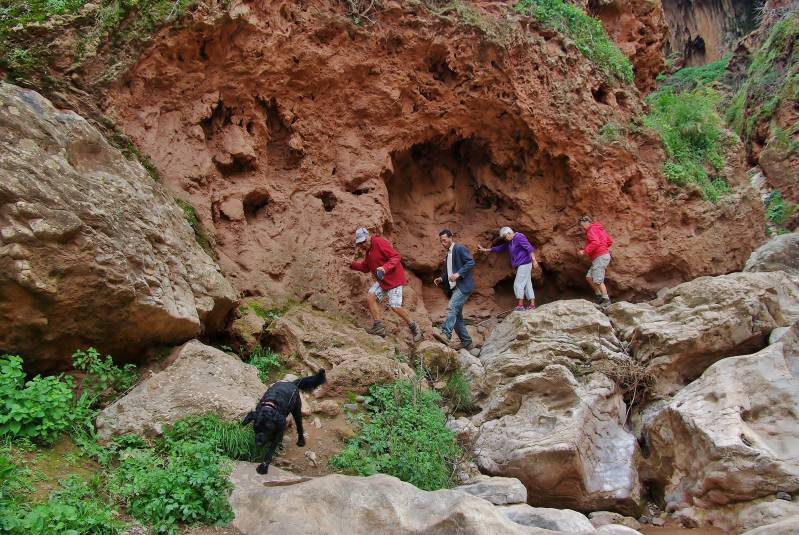 Op naar de watervallen van Ouzoud, honderdzestig kilometer van Marrakech. Mooi weer om te rijden, het is half bewolkt en zeventien graden. Het eerste deel van de route is wat saai, maar hoe dichter we bij Ouzoud komen, hoe mooier het landschap weer wordt. In de plaats Demnate maken we een tussenstop. Daar ligt een natuurlijk brug over een diepe kloof, waar je doorheen kunt klauteren. Drie jaar geleden zijn we hier ook geweest en we denken dat we de weg wel weten. En dat valt tegen en bovendien stroomt er veel water door de kloof. Enige hulp is dus welkom. En dat is geen probleem; mannetjes te over die daar op zitten te wachten. Tegen betaling uiteraard. Ondanks de hulp is het een stevige klauterpartij. Zelfs Max, de hond van Marinus en Catrien, heeft er af en toe moeite mee. Midden in de doorgang zie je uitgang, die de vorm heeft van het continent Afrika. Terwijl de ingang de vorm heeft van Zuid Amerika, met wat fantasie natuurlijk. Terug op de parkeerplaats nemen we een lange lunchpauze om bij te komen. De camping "Zebra" in Ouzoud, van een Nederlands stel, is bijna vol. We staan op een plek die eigenlijk bedoeld is voor drie campers. gelukkig komt er geen derde bij. De Wifi is hier matig, het sanitair fantastisch en de schotel werkt weer prima. Morgen naar de watervallen.