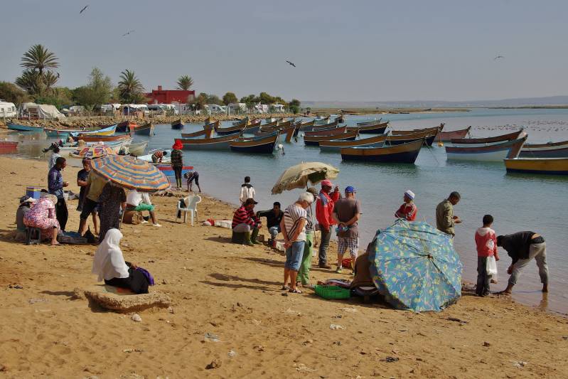 Het is weer tijd om verder naar het zuiden te trekken. We gaan naar de grote plaats El Jadida. Omdat we via Casablanca moeten, nemen we de tolweg. Dan rijdt je er omheen in plaats van er doorheen. Onderweg is het zwaar bewolkt en dat blijft zo tot in El Jadida. We bekijken daar de camping, maar omdat het nog vroeg is besluiten we door te rijden naar Oualidia, ook aan de kust. En dat blijkt een goede keuze; vlak voor de plaats van bestemming breekt de zon door. We staan op een mix-parking. Geen auto's vandaag maar wel twintig campers. De stoelen gaan naar buiten, er wordt koffie gedronken, gewandeld en geborreld. Er komen weer allerlei mannetjes langs met van alles en nog wat uit de zee. Gaan we niet op in, alleen de tajine koerier laten we niet lopen (dezelfde als vorig jaar). De bestelling wordt doorgebeld naar zijn vrouw en anderhalf uur later bij de camper bezorgd. Per bromfiets, in een grote witte bak achterop.