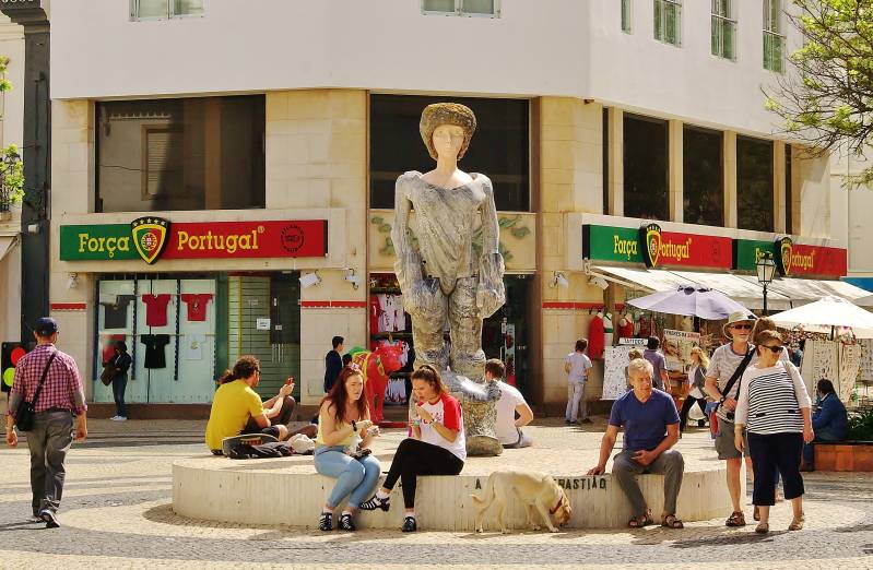 Gisteravond een hoop drukte om de camper. Zoals vermeld staan we bij een voetbalstadium. En daar wordt getraind en gevoetbald. Tot elf uur is het een gaan en komen van auto's die iets met dat trainen en voetballen te maken hebben. En dat moet dan langs onze camper. Op donderdagochtend besluiten we om weer vijfentwintig kilometer verder te trekken. Nu naar de moderne badplaats Portimão. De kuststrook hier heet Praia de Rocha; prachtige rotsformaties met mooie baaien. We staan voor twee euro vijftig per dag op de grote parkeerplaats voor campers, nog met honderdvijftig anderen. We komen veel oude bekenden tegen. Camperaars die we al eerder of in Marokko of hier in Portugal tegen zijn gekomen. Op de vrijdag fietsen en wandelen we door Portimão. En komen ook hier weer terecht in een groot, modern, overdekt winkelcentrum. Veel kledingzaken zoals Primark, H&M en C&A. In het oude centrum staan echter veel panden leeg. Mogelijk het gevolg van het nieuwe winkelcentrum.