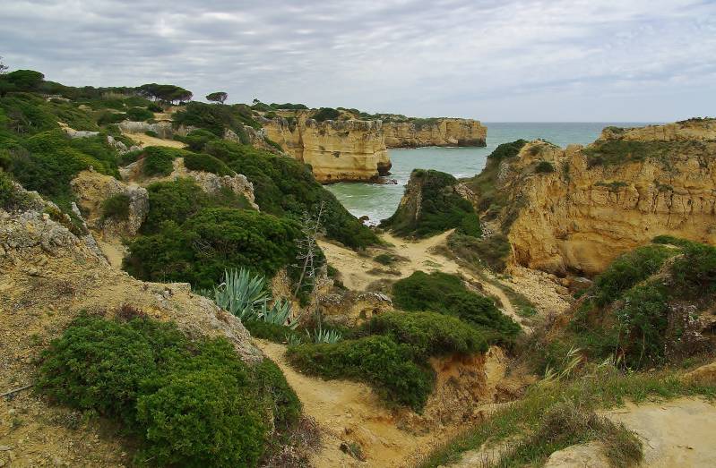 Als we opstaan is het zwaar bewolkt en we besluiten om te vertrekken uit Alvor. Via internet hebben we weer een nieuwe camperplek ontdekt in de buurt van Albufeira. Nu we hier toch in de buurt zijn, gaan we er kijken. De plek heet "Golfhino Park" en ligt officieel in Vale de Parra cq Sesmarias. Een aardige plek met stroom en Wifi. En een erg aardige eigenaar; als welkom krijgen we een mandje met wat fruit, groente en eieren van eigen erf. Met vijftien minuten lopen zit je aan zee. En ook hier weer een prachtige rotskust. Vanmiddag, de zon schijnt dan weer volop, rechtsaf een eind over de rotsen gewandeld. Op dinsdag gaan we linksaf de rotskust langs en halen bijna Albufeira. Alleen het laatste stukje heeft een te hoog klimgeitgehalte voor ons. In de middag zijn we op de fiets naar Armação de Pera geweest. Het water in het natuurgebied daar vlakbij was vorig jaar vrijwel verdwenen vanwege de aanleg van het zoveelste golfterrein. Nu stond er weer volop water en zelfs de flamingo's waren er weer. Voorlopig 1-0 zo lijkt het, voor de geitenwollensokken ten opzichte van de golfballen.