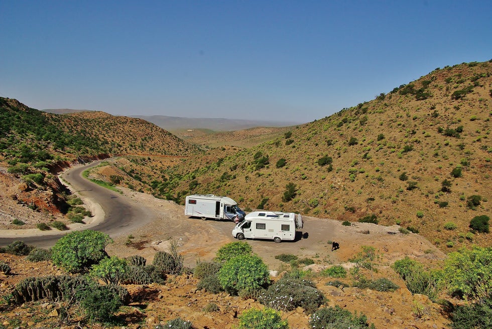 Zoals gisteren bij de borrel besproken, gaan we vandaag richting Agadir. We rijden langs de zee naar het zuiden. Een prachtige route, waar we ruim de tijd voor nemen. Met onderweg weer af en toe geiten boven in bomen om daar de laatste argaannoten weg te snoepen. We pauzeren ergens onderweg op een plateau bij de zee en zitten heerlijk in de zon. Nog wat dichter bij Agadir komen we nog een stuk of vier enorme plateaus tegen. Die staan vol met campers, wel een paar honderd. Voor weinig kun je daar vrij staan. Wij rijden eerst door naar Agadir, waar de giga supermarkt Marjane zit, voor wat boodschappen. Agadir is een grote, westers aandoende stad. Mooie brede wegen, maar ook druk, mogelijk ook omdat het vandaag zaterdag is. Na het boodschappen doen moeten we tien kilometer terug langs de kust en in het dorp bij de eerste rotonde rechtsaf, voor de laatste vijf kilometer naar de camping. Wij rijden voor, het dorp in via een bar slechte, drukke weg. En dan zijn we plotseling Marinus en Catrien kwijt. Met wat moeite kunnen we omkeren op zoek naar de andere camper. Die zien we staan bij de rotonde, bij een controlepost van de politie. Marinus is al druk in gesprek met een agent. Hij zou op de rotonde geen voorrang hebben verleend. Marinus is zich van geen kwaad bewust, maar er is geen ontkomen aan. Schade: vijfhonderd dirham, een kleine vijftig euro. Er wordt een formulier ingevuld aan de hand van het paspoort, kentekenbewijs enzovoort. We helpen de man nog bij het uitzoeken van de juiste gegevens. Anders waren we zo een paar uur verder geweest. Uiteindelijk kunnen we verder en komen via de bar slechte weg op de gelukkig fraaie camping. Helaas werkt de dongel van Maroc Telecom hier niet. En de vorig jaar nog perfecte Wifi is defect. Die zal het morgen weer doen. Op zondag is iedereen op zijn manier druk. Marinus en Max worden geschoren en er wordt gewassen. Wij gaan op de fiets het dorp in en vinden een zaakje waar ze televisieschotels verkopen. Een schotel, lmb kop, satelliet finder, een standaard en tien meter kabel voor omgerekend vierendertig euro. Man blij, wij blij, tenminste dat hopen we. Maar eerst nog even doorgefietst naar de mega overwintercamping aan de kust en het daar vlakbij gelegen eerste plateau, waar je vrij kunt staan. Mudvol en druk druk druk. Vervolgens terug om de schotelspullen op te halen. Nog een heel gedoe, zo'n groot rond ding van negentig centimeter mee te krijgen op de fiets. In de middag alles in elkaar gezet. Alles werkt, behalve, het zal ook eens wel, het uitrichten van de schotel. In de buurt zit één grote boom en die geven we maar de schuld. En nog steeds geen Wifi: we spreken af morgen verder te reizen.