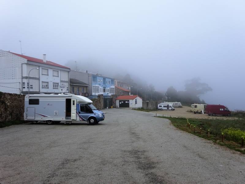 Op zaterdag rijden we weer verder naar het westen. Het is opnieuw een regendag: en als dat dan toch moet, dan maar tijdens het rijden. De route is niet bijzonder: hoofzakelijk over autobanen en weinig te zien. Een paar keer gaan we onderweg op zoek naar camperplaatsen. Maar weg van de snelweg betekend hier smalle en kronkelige weggetjes; niet leuk met een camper. Uiteindelijk komen we aan in de plaats Fisterra. Zo ongeveer de meest westelijk gelegen plaats in Spanje, pal aan zee. Niet heel mooi, maar wel bijzonder. Vooral wat de mensen betreft. Heel veel jongelui met rugzakken en stokken. Veelal op weg naar Santiago de Compostella. Het stikt hier dan ook van de hostels. We staan op een betaalde camperplek, met name vanwege de Wifi. En het is droog hier, alleen hangt er een dikke mist.