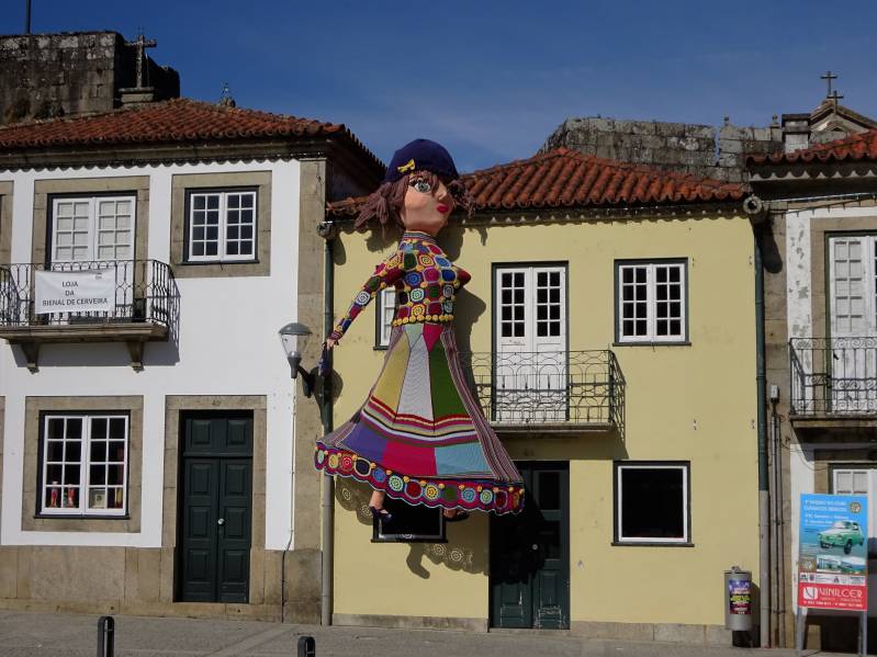 Die mist is nog dikker geworden op de zondagmorgen. Als we gaan rijden hebben we alle denkbare verlichting aan. Maar na twintig kilometer rijden is het opeens helder en schijnt de zon volop. We willen nu echt naar het zuiden, maar moeten eerst terug naar Santiago de Compstella. En daar moeten we dwars doorheen, met alle oponthoud van dien. Uiteindelijk komen we in de buurt van de Spaans-Portugese grens. We stoppen nog in Spanje, in de plaats Arcade en staan op een camperplaats bij de haven. De mooiste plekken zijn al bezet, maar voor één nacht staan we prima. Op maandag gaan we naar Portugal. Het wordt de kortste route tot nu toe: 59 kilometer. Bovendien is het een uur vroeger in Portugal, dus we zijn vroeg op de plek die we uitgezocht hebben. En dat is een camperplek in het dorp Vila Nova De Cerveira, pal aan de grensrivier de Rio Mino. Omdat we vroeg zijn, gaan we gelijk het dorp in. En dat ziet er heel bijzonder uit. Bijna alles is versierd met brei- en haakwerk. Lantarenpalen, bomen, gevels enzovoort. Het waarom is ons niet duidelijk, maar het ziet er feestelijk uit. Na de middag gaan we fietsen. Min of meer bij toeval ontdekken we een fietsroute langs de Rio Mino. Nieuw aangelegd en heerlijk om te fietsen. Na vijftien kilometer komen we eindelijk een terras tegen. Daar waren we hard aan toe. Om vervolgens weer vijftien kilometer terug te fietsen.