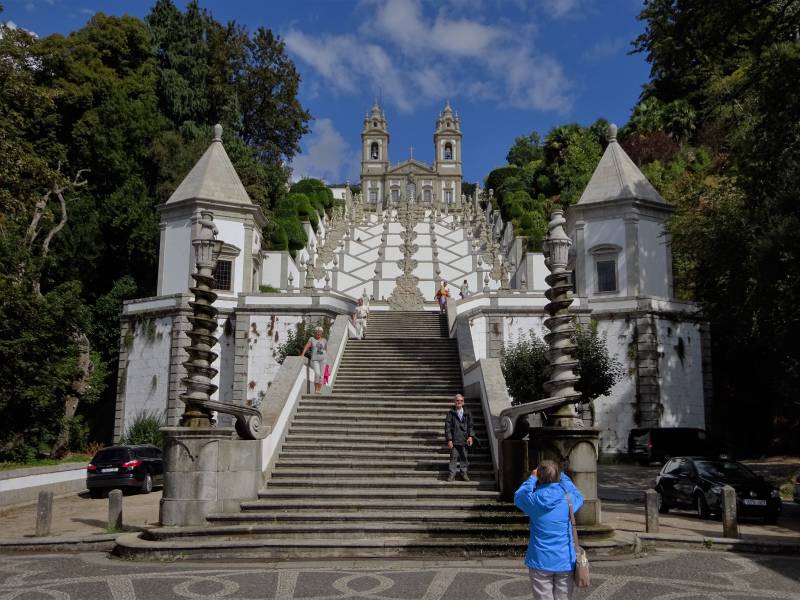 We hebben slecht geslapen vannacht: regen, onweer, nog meer regen en voorbijrazende goederentreinen. Camperen valt niet altijd mee. Gelukkig is het bij het vertrek weer droog. We gaan eerst naar de kust, naar de plaats Viano de Castello. Met een oeroud centrum met veel kleine winkeltjes en kerken in alle soorten en maten. Erg leuk om doorheen te wandelen. Vervolgens rijden we naar de grote stad Braga. Onderweg komen we langs enorme hellingen die in de fik gestaan hebben. het ziet er erg triest uit en het stinkt er nog enorm. Braga schijnt het Rome van Portugal te zijn daar waar het gaat om het aantal kerken. We kiezen er één met de mooie naam Bom Jezus do Monte. Een basiliek hoog op een heuvel en bereikbaar via een kronkelpad en trappen met in totaal meer dan duizend treden. Met daarlangs een aantal kapellen waarin levensgrote beelden de lijdensgeschiedenis van Jezus weergeven. En ben je eindelijk boven, dan moet je natuurlijk ook weer naar beneden. Terug bij de camper is de conclusie dat we voor deze reis genoeg kerken gezien hebben. Tot slot rijden we nog een uur richting Porto. Daar ergens in de buurt stoppen we in het dorp met de mooie naam Soa Marmede de Coronado.