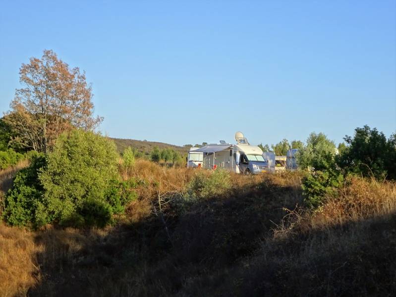 Op de vrijdag gaan we weer verder naar het zuiden. We proberen zo veel mogelijk de tolwegen hier te vermijden. Helaas lukt dat nauwelijks. Soms herkent de TomTom een tolweg niet, en vaak zijn er ook geen alternatieven. Je kunt zo maar plotseling op een tolweg rijden. Om de vijf kilometer staat op borden de prijs aangegeven. Met een soort elektronische cameraregistratie. Geen idee hoe we moeten betalen, mogelijk komt de rekening naar Apeldoorn. In de buurt van Lissabon wordt het wat handiger. Bij de oprit een kaartje pakken en bij de afrit betalen. Het wordt een lange rit en hoe verder we zuidwaarts rijden, hoe warmer het wordt. Het is hier kurkdroog: eindeloze bruine velden waar alleen de kruinen van de kurkeiken nog een groene kleur hebben. We stoppen ter hoogte van de grote plaats Evora en staan bij een stuwmeer met de naam Pego do Altar. Bij, alweer, een restaurant. Dat is nu gesloten, maar vlakbij staat een toiletgebouw met zelfs warme douches. En dat is wel open, we maken er dankbaar gebruik van.