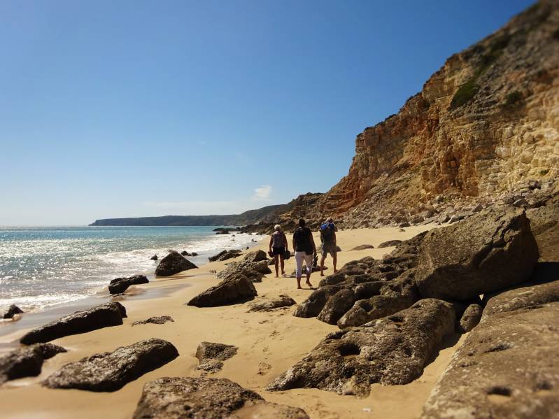 De maandag is een drukke dag. Er moet gewassen worden en we zitten nog met de lekke band die gerepareerd moet worden. We gaan van Porto Covo in één rechte lijn naar beneden en stoppen in de plaats Aljezur. Daar zit een supermarkt van de Intermarche, met een paar hele grote wasmachines. Voor twaalf euro hebben we achttien kilo schone en gedroogde was. Het kost wat tijd, maar uiteindelijk ligt alles weer keurig opgevouwen in de kastjes. De volgende actie is het vinden van een bandenzaak. Die is om twee uur weer open en we laten de lekke band er achter. Kunnen we morgen weer ophalen. We besluiten om naar het natuurgebied in Carrepateira te gaan. Daar zijn twee camperplaatsen waar we al vaker geweest zijn. Op de eerste plek is het enorm druk. Een aantal campers, maar nog veel meer busjes en auto's met surfspullen er om heen. Het lijkt of de vakanties hier nog in volle gang zijn. Maar het ergste is nog dat de politie druk doende is waarschuwingen en of bekeuringen uit te delen. We gaan op zoek naar de tweede plek. En daar is het nog veel drukker. De camper staat goed en wel op zijn plek, de stoelen en de koffie staan klaar, komt ook hier de politie langs. Overnachten is verboden; parkeren mag, maar "campinggedrag" niet (tafel en stoelen buiten, luifel uit enzovoort). We besluiten maar te vertrekken. En vooralsnog zijn wij de enige. We kunnen ons ook niet voorstellen dat alle honderdvijftig voertuigen waarin geslapen kan worden, vanavond verdwenen zijn. Handhaven blijkt ook in Portugal een lastig begrip. We gaan weer twintig kilometer terug naar Aljezur. Daar is wel een legale overnachtingsplek. We wandelen er naar het kasteel, hoog op een heuvel en gaan tot slot nog even internetten op het terras van de supermarkt. Op dinsdagmorgen trekken we echt de Algarve in. Niet nadat we eerst de camperband hebben opgehaald. Die staat keurig klaar; de kosten zijn dertien euro inclusief het terugplaatsen op de camper en het controleren van de spanning van de andere banden. We zijn helemaal tevreden. Dan op pad. We beginnen in de buurt van Sagres, aan de westkant van de Algarve. We hebben een vrij nieuwe camperplaats uitgezocht in het dorp Fiqueira. Een betaalde plek met alle denkbare voorzieningen. Als we het terrein op rijden komen we meteen Thea en Emile tegen, die hier ook neergestreken zijn. Er wordt heel wat bijgekletst. Na de middag gaan we aan de wandel. Een kleine twee kilometer verderop zit je aan het strand. En voor een uithoek als deze vinden wij het er druk. Veel toeristen met huurauto's, vooral Duitsers, Engelsen en Nederlanders. Terug bij de camper gaan we met z'n vieren aan de borrel; een soort traditie als we elkaar tegenkomen tijdens het reizen. Als we in de loop van de avond de televisie aan willen zetten, heeft de schotel opeens kuren. Het ding kan de satellieten niet meer vinden. Dus vanavond maar geen tv kijken. Gelukkig hebben we een goede internetverbinding, we komen de avond wel door. En morgen zien we wel verder.