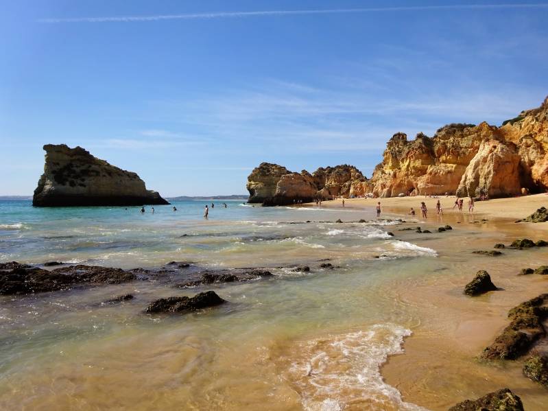 Nog twee dagen Alvor. Het weer blijft prachtig, dus we nemen het er maar van. Op maandag gaan we fietsen naar Portimão. Via de boulevard naar de voormalige camperplaats, daarna het oude centrum in en tot slot naar het grote overdekte winkelcentrum Aqua. Daar drinken we koffie en gaan er eten. Een "nieuw" concept. Een buffet met van alles en nog wat: warm, koud, vis, vlees enzovoort. En een groot bord en dat schep je vol met alles wat lekker lijkt. Bij de kassa wordt je bord gewogen en betaal je € 1,30 per honderd gram. We nemen er een glas wijn bij: een groot glas en stevige wijn. We moeten opnieuw aan de koffie voor we terug kunnen fietsen. Op dinsdagmorgen nemen we afscheid van Thea en Emile. Zij gaan langzaam verder richting Spanje, wij blijven nog even. We prutsen wat in en rond de camper. Een onwillige kraan blijkt de geest te hebben gegeven; we moeten op zoek naar een nieuwe. Gelukkig doet de schotel op het dak van de camper het wel weer. Een hoop gepruts, maar dan heb je ook wat. De middag brengen we op het strand door. Of beter, in de zee. Heerlijk bij deze temperaturen.