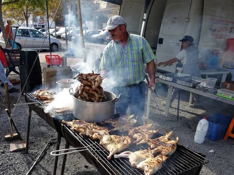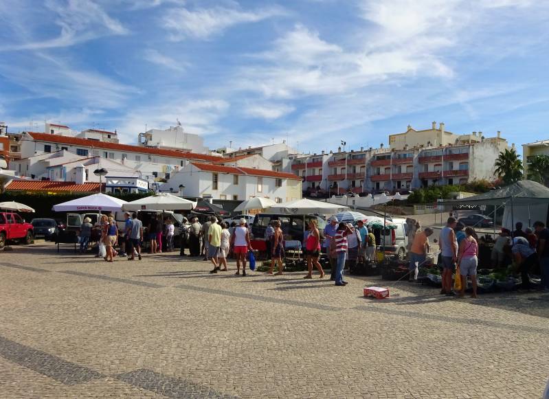 Zaterdag wordt dus een marktdag. We gaan eerst op de fiets naar Castro Marim. Een erg grote markt daar, deels op de camperplek, waar dus nu even geen campers staan. Helaas weer veel van hetzelfde: kleding, schoenen, groente, fruit en potten en pannen. En een kraam waar kip piripiri klaargemaakt wordt. Dat laten we niet aan onze neuzen voorbij gaan. Van Castro Marim gaan we naar Vila Real, na eerst koffie gedronken te hebben bij een uitkijkpunt. In Vila Real is het druk, veel dagtoeristen en dan vooral Spanjaarden. Er zijn hier zelfs twee markten: een "gewone" markt en een antiek/rommel markt. Bovendien is er een kermis op het terrein van de camperplaats, die dus veertien dagen geen camperplaats is. Terug bij de camper puffen we uit op het strand en gaan daarna wandelen naar Altura, een dorp verder. Dat wat daar vorig jaar nog een gratis camperplaats was, is nu afgesloten met hoogtebalken. Nu een kale, lege vlakte. Het gevolg is dat er nu aan het einde van het dorp, op een ruig terrein, vijfentwintig campers staan. Vorig jaar nog streng verboden, nu wordt dat kennelijk gedoogd. Moeilijk te volgen hier op dit moment. Op zondagmorgen gaan we opnieuw wandelen. Zoals elke keer wanneer we hier zijn, gaan we naar het gehucht Cacela Velha. Een pittige wandeling door een ruig lagunegebied. Het gehucht heeft een gesloten kasteel, een kerk en een begraafplaats. En wat huisjes daar omheen. En het is een mooi uitkijkpunt over het lagunegebied. Het is er druk want er is een kerkdienst aan de gang. Er is één kroegje open, waar we natuurlijk koffie drinken.
