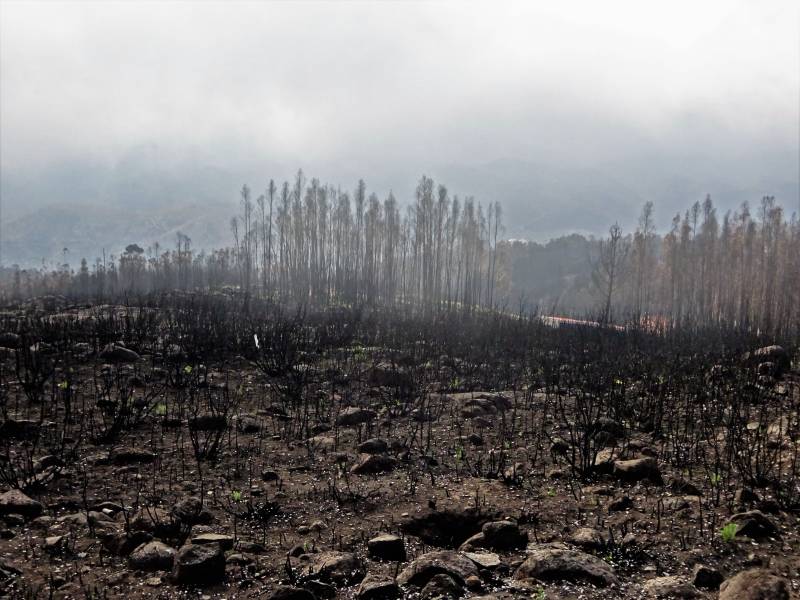 De laatste dag in Alvor: nog wat wandelen, fietsen en in de zon zitten. En voor in de avond inpakken. Op donderdagmorgen gaan we vroeg weg. We gaan eerst de Monchique op, de hoogste berg van Portugal. En ook hier veel sporen van de bosbranden dit jaar. Vooral even onder de top staan enorme hellingen met resten van verbrande bossen. Je ruikt nog steeds de brandlucht. Boven op de top heb je een geweldig uitzicht, kilometers ver. Alleen vandaag niet. Er is een wolk over de top gezakt; het zicht is amper honderd meter. Het volgende deel van de etappe gaat van de Monchique naar de plaats Aljezur, aan de westkust. Daar zit een bedrijf waar ze verstand van zonnepanelen en accu's hebben. En, we waren er al bang voor, onze accu is zo goed als overleden. De nieuwe accu is van het merk Rolls (zonder Royce). Hoewel qua prijs is het inderdaad de Rolls Royce onder de accu's; en nu maar hopen dat dat ook geldt voor de kwaliteit. Als we willen pinnen blijkt dat onze passen en het pinapparaat het niet eens kunnen worden. Wim gaat met de monteur het dorp in op zoek naar pinautomaten. Na drie banken is eindelijk het bedrag bij elkaar gepind, wat een gedoe. Aan het einde van de middag zoeken we de camperplaats in Aljezur op. Het is er rustig, er staat nog één andere Nederlandse camper. Op de vrijdag gaan we, wat de camper betreft, naar de eindbestemming van deze reis, naar Sao Bartolomeu de Messines. Vanaf Aljezur gaan we nog een keer via een prachtige route over de Monchique. En wat vooral opvalt onderweg is dat de heide hier nog in bloei staat. Het weer is somber maar nog droog. Volgens de voorspellingen gaat het een erg natte dag worden. Tot Messines valt het nog mee, maar als we goed en wel geïnstalleerd zijn, krijgen we een enorme hoosbui over ons heen. En in de loop van de avond komt er nog veel meer water naar beneden.