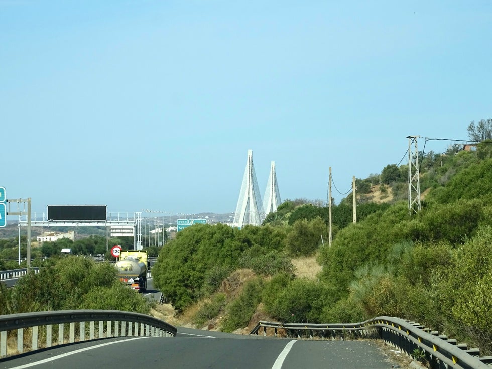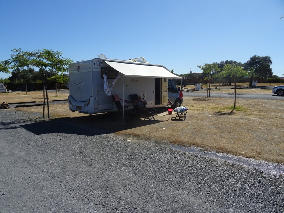 Het was heerlijk rustig in Marchal de afgelopen nacht. We hebben heerlijk geslapen, mede omdat het erg fris werd. En dat was vandaag weer een heel ander verhaal. Voor half tien gaan we rijden. Weer de grote weg op naar Granada, Sevilla, Huelva om tenslotte in Portugal uit te komen. Het landschap is prachtig: grillige rotsformaties en daartussen enorme velden met olijfbomen. En in de middenberm staan grote struiken oleander. Volop in bloei: wit, roze en rood, een paar honderd kilometer lang. Met hier en daar een strook met verbrande struiken. We komen zelfs langs een strook waar de struiken in brand staan. Als mogelijke oorzaak vermoeden wij een sigarettenpeuk. Het passeren van Granada is geen probleem, daar ga je met een grote boog om heen. Sevilla is een ander verhaal. Al ver voor de plaats verandert het landschap. Veel grote, kale vlaktes en erg veel oude, vervallen bouwwerken. En wat er nog van over is, zit onder de graffiti. En dan Sevilla zelf: daar moet je dwars doorheen. En ondanks het middaguur is het filerijden: niet leuk. Als we Sevilla eenmaal gehad hebben gaan we dubben over een overnachtingsplek. Min of meer bij toeval komen we een vrijwel nieuwe camperplaats tegen, vlakbij het dorp Beas, nog in Spanje. Een tien kilometer voor Huelva, rechtsaf het binnenland in. Een prachtige camperplaats met de naam El Alamo. Alles is nieuw: van loosplek tot en met een prachtig sanitairgebouw. Dat kost nu nog dertien euro (ex.stroom). Nog niet alles is klaar begrepen we van de beheerder. Er zal waarschijnlijk ook nog wel een zwembad komen. Je zit hier dertig kilometer van de zee af en dat is eigenlijk te ver. Nu, met een stuk of acht campers is de bezetting nog erg matig. Wij maken dankbaar gebruik van de wasmachines: die dingen staan er niet voor niets en nu we er toch zijn.... En dan tot slot nog even over het weer. De eerste paar uur was de temperatuur heerlijk tijdens het rijden. Maar hoe dichter we bij Sevilla kwamen, hoe warmer het werd. En hier op de camperplaats liep die temperatuur op tot wel veertig graden. We houden van mooi weer, maar dit is wat te veel van het goede.