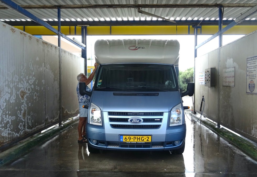 De laatste dag in Tavira en die beginnen we met een wandeling. We weten een aardig rondje door het achterland van de camperplaats. Maar we stuiten op een wegafsluiting middels een nieuw, hoog hek. Het alternatief is een rondje de andere kant op, langs een hele grote Chinese winkel. Handig als je iets nodig hebt, maar niet om er gezellig te shoppen. Dat doen we dus in het grote overdekte winkelcentrum “Tavira Plaza”. Altijd leuk om er een keer rond te neuzen; maar vooral om er heerlijke koffie te drinken. Na de middag gaan we nog een keer naar het strand. Er zijn nog steeds veel zonaanbidders, en stel vissers en ferryboten die heen en weer varen. Je kijkt je ogen uit. Morgen gaan we dus verder, op naar Monte Gordo. Onderweg, in de buurt van het dorp Cabanas, weten we een plek waar we de camper kunnen wassen. Kunnen we met een schone camper, hopelijk, de camping op.