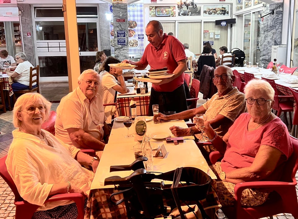 Het eerste wat we doen vanochtend is de camper op een andere plek zetten. Een plek met wat meer schaduw van een oude, mooie olijfboom. We blijven hier zeker nog tot dinsdagmorgen en met deze temperaturen is wat extra schaduw erg aangenaam. We gaan weer fietsen vandaag. Een bekende route naar een stadje verder, Fuzeta. Via het fietspad dat langs de kust van de Algarve loopt: en dat heet nu “Rota da Costa Atlantica”. Een nieuwe naam en dus nieuwe routeborden. Helaas geldt dat niet voor grote delen van de route. Met name de gravelstroken, waar ook landbouwvoertuigen gebruik van maken, worden steeds slechter. Via Santa Luzia, Pedras del Rei en Luz, kom je vanzelf in de badplaats Fuzeta. Ook daar is het enorm druk: het is nog volop vakantietijd hier. We drinken er koffie en eten er wat voor we aan de terugtocht beginnen. En zoals altijd als we hier in de buurt zijn, pauzeren we op het terras van Café Santa Luzia. En kroeg waar vooral bijzondere gasten komen en waar wij ons prima thuis voelen. Mede vanwege de aangename prijzen: een blikje Lipton citroen en een flesje bier kosten nog geen drie euro. Een glas is niet nodig: daar doen de andere gasten ook niet aan. Terug bij de camper hebben we er veertig kilometer opzitten: gelukkig hebben ze op deze camperplaats goede douches. Tegen de avond gaan we weer de stad in voor een rondje muziekoptredens. De meeste indruk maakt, althans op ons, twee dames met Fado-muziek en twee muziekanten die een groot deel van het publiek aan het dansen krijgen. Helaas viel het eten wat tegen. Na enig huiswerk gedaan te hebben, leek een “bifana”, een broodje warm vlees, een goed idee. Maar het was erg veel droog brood en weinig vlees. We hebben weer wat geleerd.