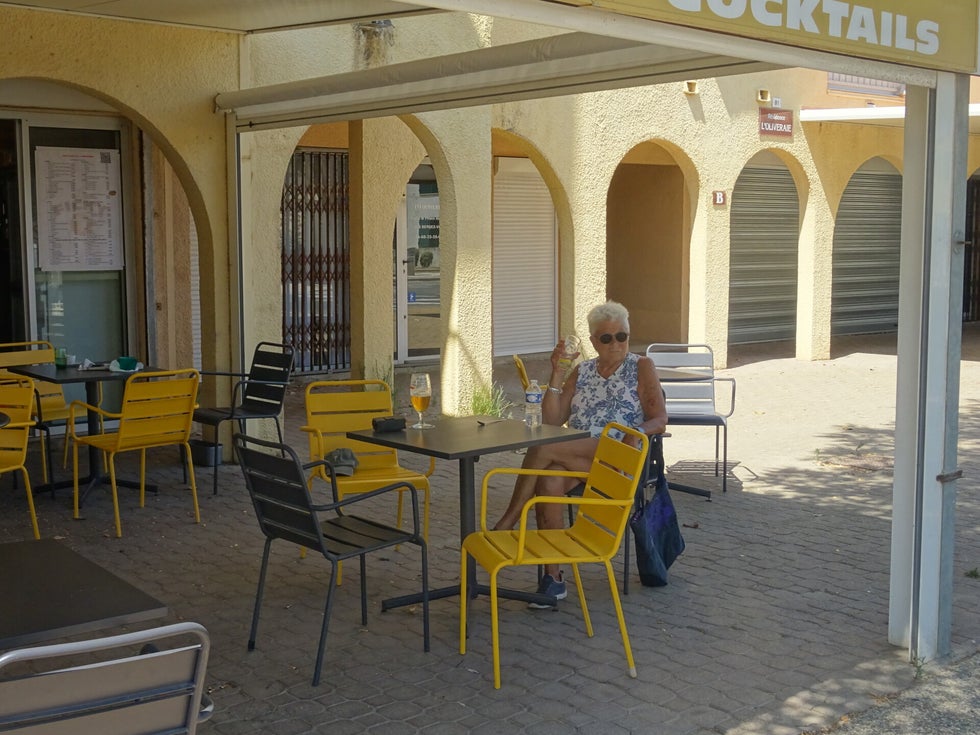 We gaan naar de Middellandse Zee: een ritje van honderdvierentwintig kilometer. We gaan weer naar de camperplaats van Saint Pierre la Mer. Al jaren een vaste stopplaats als we in deze regio zitten. Hoe dichter we bij de kust komen, hoe drukker het wordt; de vakanties zijn hier nog in volle gang. We hebben het nog nooit zo druk meegemaakt hier. De camperplaats in Saint Pierre is behoorlijk bezet, maar we vinden nog een mooie plek met een fraai uitzicht. En voor het eerst deze reis in Frankrijk zien we een andere Nederlandse camper. Verder zien we we enkel witte, en dan met name Franse nummerborden. Na de middag maken we een wandeling. Een bekend rondje: langs het strand naar de markt en over de “hoofdstraat” weer terug. Het is gezellig druk in het centrum, alle terrassen zijn open en behoorlijk bezet. Bovendien is er een grote kermis en er zijn een lange rij bontgekleurde huisjes opgesteld. Als we het goed begrepen hebben, worden daar morgen met name streekproducten verkocht. In Duitsland kom je dit soort bouwsels ook wel tegen, maar dan meestal voor de Kerstdagen. Op de terugweg belanden we op het terras van de bar Le Ficky; we zijn er vaste klant als we hier zijn. De bar heeft twee jaar te koop gestaan, maar die borden zijn verdwenen en de eigenaar loopt er nog altijd vrolijk rond; hij doet of hij ons herkent. Later op de middag gaan we nog even naar het strand: de temperatuur, zo’n dertig graden, is er naar. Maar er staat een erg harde wind. We houden het precies een uur vol.
