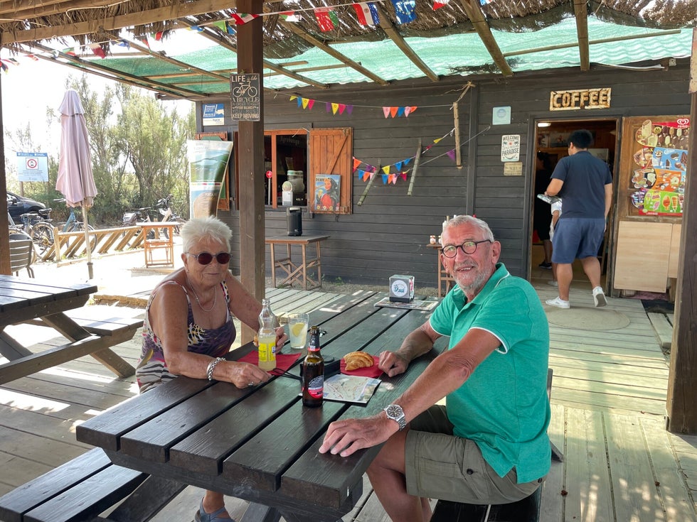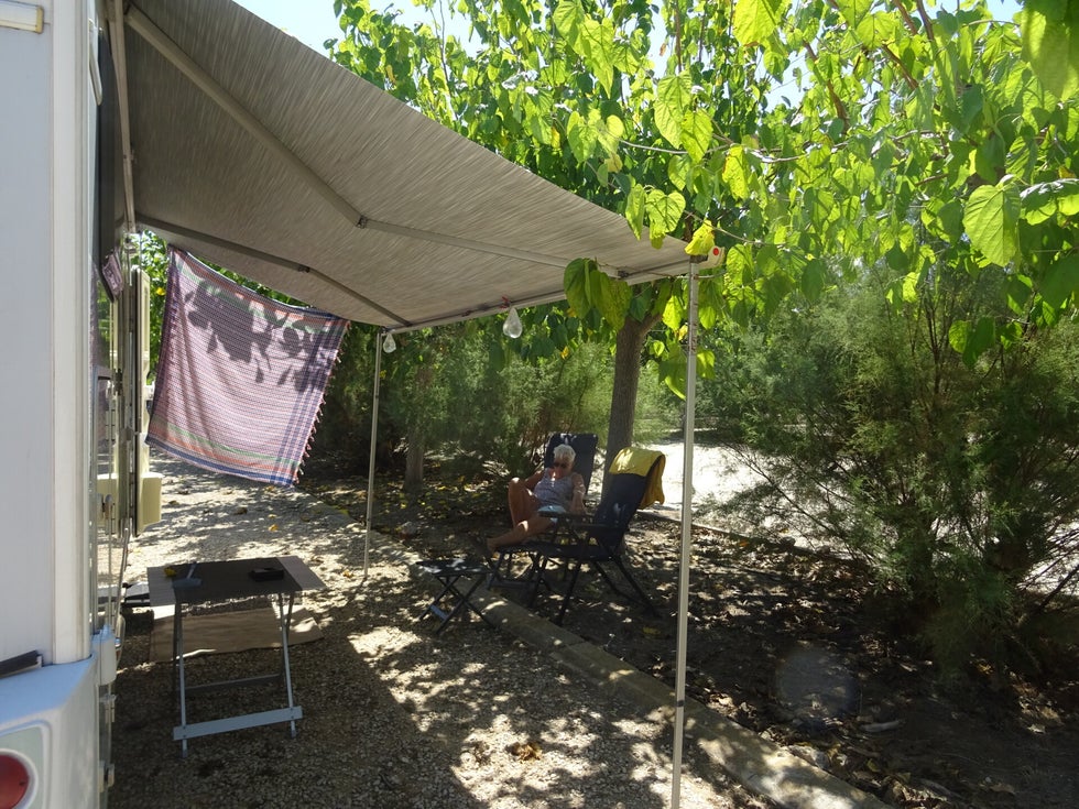 Dag twee in L’Aldea: tijd voor een fietstocht. Bij het toeristenbureau hebben we een kaart gekregen met op het oog een aardige route door de Ebrodelta. Maar bij ons wordt het “dwalen door de rijstvelden”. Enorme velden met rijstplanten met de voeten in het water. Op één akker is de oogst al binnengehaald en dat is nu het domein van een zwerm ibissen; erg schuwe vogels overigens. Maar mogelijk lag dat aan onze fietshelmen die we voor het eerst ophadden. Van de geplande route komt weinig terecht, vooral vanwege het ontbreken van een groot aantal routeborden. Maar als de nood het hoogst is, is de iPhone nabij. Ergens aan de oever van de Ebro drinken we koffie. Op een Spaans terras, in de schaduw en met Spaanse prijzen. Uiteindelijk komen we bij de zee terecht bij een strand met de naam Lo Golero. Maar er staat een stormachtige wind. Geen strandweer dus maar in plaats daarvan belanden we in de luwte van een strandtent. We worden op de foto gezet door een aardige ober. Om twee uur zijn we terug bij de camper na ruim zesendertig kilometer fietsen. Het uitpuffen doen we in de schaduw van de bomen voor de camper. Ondanks de wind is het weer een erg warme dag. De camperplaats lig aan een Via Verde, een voormalige spoorlijn en nu een fietspad. Na het eten gaan we op onderzoek uit. Maar na drie kilometer fietsen is het uit met de pret: de Via Verde is nog niet af. De contouren van de voormalige spoorlijn zijn nog zichtbaar, maar er is niet te fietsen. We moeten nog een keer terugkomen als het project af is. Morgen de volgende etappe.