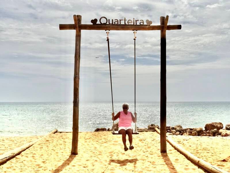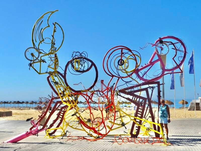 We beginnen de dag met een fietstochtje langs de zee. Via een gravelpad naar Vilamoura, de luxe badplaats met een haven met peperdure bootjes. Vilamoura gaat naadloos over in de badplaats Quarteira: meer voor de gewone mensen zeg maar. Daar, aan het einde van de boulevard, drinken we zoals gewoonlijk weer koffie. Een eindje verder heb je een Lidl en een heel groot marktterrein. Op de woensdagen helemaal vol met kramen met vooral kleding, op de andere dagen een camperplaats. Er staan nu een stuk of vijf campers op de hele grote, kale vlakte. Wij worden er niet vrolijk van. Ooit had je her en der gedoogplekken in Quarteira en een aardige camping. Die gedoogplekken zijn al lang verdwenen en ook de camping heeft de geest gegeven. Jammer voor een op zich aardig stadje. Op de terugweg fietsen we door de haven van Vilamoura: leuk om bootjes te kijken. Maar voor ons niet de plek voor koffie of eten. Na de middag gaan we weer naar het strand. Het is erg warm. En ondanks hoge golven gaan we twee keer de zee in om af te koelen. Zoals de meeste mensen doen als ze op het strand zijn.
