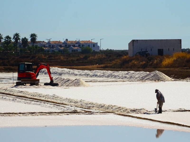 We hebben een welbestede dag achter de rug. Als eerste maken we weer een fietstocht; deze keer naar Cabanas, een dorp verder. We hebben er jaren geleden twee keer op de camping gestaan. Toen net geopend en een nog erg open terrein. We herkennen de ingang, het restaurant en het zwembad, maar dat is het dan ook wel. Op bijna het hele terrein staan nu hoge bomen en grote struiken. Maar net als destijds is het nog steeds een Engelse camping. Zoals bijna overal in Cabanas de voertaal Engels is. Op de terrassen hoor je niet anders. Op de terugweg komen we weer langs de zoutpannen waar net het gedroogde zout binnen gehaald wordt. Het zal je baan maar zijn. Na de middag gaan we weer naar het strand om in de zee af te koelen; het is weer een erg warme dag. En om alle zoutresten weg te spoelen gaan we op de camperplaats onder de koude douche. Het weer is er naar en, niet onbelangrijk voor Nederlanders, die zijn nog gratis ook. Na die koude douches krijgen we visite. Dirk en Anneke, van een paar campers verder, komen borrelen en bijkletsen. Dat was weer gezellig en voor we er erg in hadden, was de dag alweer voorbij.