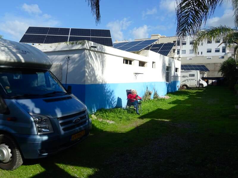 We hebben weer een bijzondere dag achter de rug. Om kwart voor negen zijn we al in de haven van Algeciras en kunnen we aansluiten in één van de lange rijen met campers. Allemaal in de wacht voor echte kaartjes voor de overtocht. Maar als we goed en wel de koffie op hebben, begint er beweging in de lange rijen te komen. Om kwart over tien staan we ergens vooraan op de boot en die vertrekt om half elf. Op de boot zit een Marokkaanse politieagent die een stempel in de paspoorten moet zetten. Daar hebben we een uur in de rij gestaan. Eénmaal in de haven van Tanger Met gaat alles ongekend snel. Geen gedoe met de scanner en in tien minuten was de inrijkaart voor de camper door de douane geregeld. Zo snel hebben nog niet eerder meegemaakt. Om half twee zitten we al op de snelweg, waar we besluiten door te rijden naar een camping in Kenitra. Iets te overmoedig bleek achteraf. Om te beginnen was het toch nog een flink eind rijden. En de Camping Mehdia ligt een eind buiten het centrum. En je moet dwars door dat hele grote centrum heen, nu tijdens de avondspits. Als je daar heelhuids doorheen komt kun je heel Marokko aan. Maar we hebben Camping Mehdia gehaald. Ooit prachtig aangelegd, maar zoals vaker hier in Marokko, de laatste jaren niet meer onderhouden. Maar voor één nacht voor ons een prima plek. Tot slot nog even over het weer. Het was een zonovergoten dag van Algeciras tot Kenitra; wel met een fris windje.