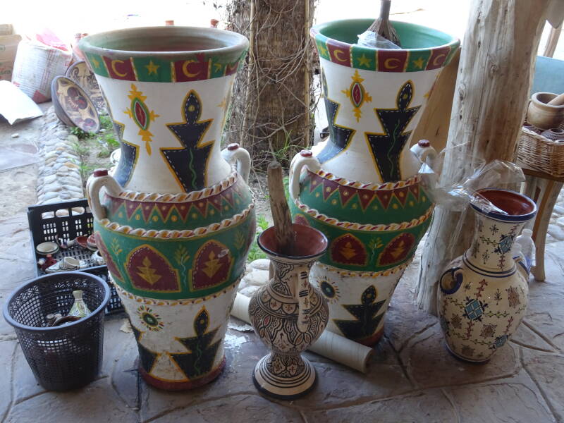 Een dag die zonnig begint. Maar dan pas om negen uur, want dan komt die zon boven een bergwand te voorschijn. We halen de fietsen uit de camper voor de eerste fietstocht in Marokko: er moeten boodschappen gedaan worden. En, omdat we toch in de buurt zijn, nemen we ook een kijkje in de “kunstenaarssteeg”. Een steeg met allemaal souvenirs winkeltjes, kleding, sieraden en kunstnijverheidsproducten. Leuk om er doorheen te slenteren. Je hebt alle tijd om er te kijken en je wordt niet lastig gevallen door opdringerige verkopers. Tussen de boodschappen door gaan we aan de avocado-shake, op “ons” vaste adres. Overigens niet alleen ons vaste adres; het terrasje zit er regelmatig vol. Voor in de middag, het is dan inmiddels zwaar bewolkt, maken we een wandeling door het achterland van de camping. Ook daar nog duidelijke sporen van de overstromingen van een paar weken geleden. Er wordt aan de weg gewerkt om toekomstige wateroverlast zo veel mogelijk te beperken. Aan het einde van de middag komen Paul en Arendien langs voor een drankje, een hapje en een gezellige babbel. Dat alles doen we maar in de camper want buiten is het uitgesproken fris geworden. En wat later begint het zelfs een beetje te regenen: gelukkig niet meer dan een buitje voor het stof.
