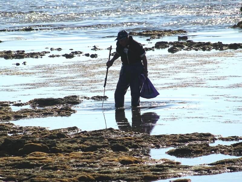 Een visser op zoek naar mosselen.