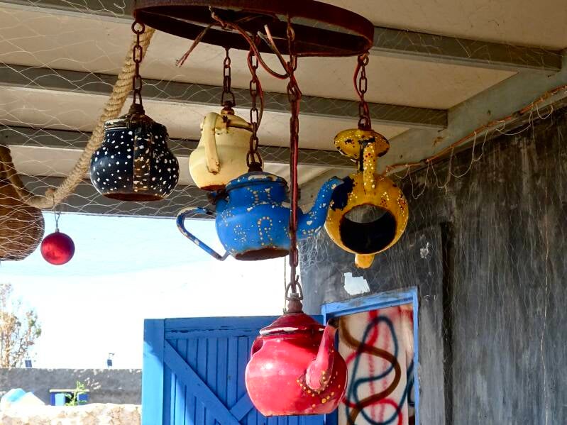 Een bijzondere lamp op het terras van Café Mazro.