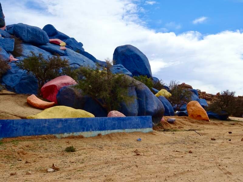We moeten vandaag eerst weer onder de douche bij de hamam. Wobbie moet om elf uur bij kapper Abdu zijn. En eerst zelf je haren wassen is wat handiger dan het geknoei in een klein bakje bij hem. De knipbeurt gaat gesmeerd. Na een half uur zijn de kapper en de klant tevreden. Na de kapper is de schoenmaker aan de beurt. Ook hij moet aan de slag. Elke keer als we hier komen zijn er wel een paar schoenen die gerestaureerd moeten worden: altijd bij dezelfde schoenmaker. Hij herkent ons onmiddellijk en de begroeting is hartelijk. Omdat we toch in de buurt zijn gaan we weer aan de verse jus. Het is er gezellig druk op het leukste pleintje van Tafraout. Dus duurt het even voor we aan de beurt zijn. Maar we hebben geen haast; we zakken wat onderuit en zien het leven van alle dag in Tafraout aan ons voorbij trekken. Na de middag gaan we weer fietsen. Samen met Arjan gaan we naar de gekleurde rotsen. Vroeger waren dat blauw geverfde rotspartijen, maar een paar jaar geleden zijn ze in meerdere kleuren overgespoten. Het is één van de grootste bezienswaardigheden hier in deze streek. Vandaag is het er erg rustig. Tot voor kort stonden ook daar altijd wel een aantal campers “vrij”. Maar er komen steeds meer verbodsborden: overnachten met een camper mag er niet meer. We begonnen de dag met veel zon, maar naarmate die vorderde kreeg de bewolking de overhand en werd het uitgesproken fris. Rond zeven uur miezerde het zelfs een klein beetje. Nattigheid die we morgen niet kunnen gebruiken. We moeten om tien uur bij de garage van MoMo en Said zijn voor het opnieuw spuiten van de achterbumper van de camper. Dat wordt weer een avontuur op zich.
