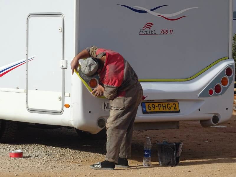 Weer een bijzondere dag in Tafraout. We moeten om tien uur bij de garage van MoMo en Said zijn. En dat is een open lucht garage met enkel een spuitcabine. Alles wordt buiten gedaan, behalve het serieuze spuitwerk; dat wordt in die cabine gedaan. Als we er stipt op tijd aankomen, is het er een drukte van jewelste. Wel zes campers komen er tegelijk binnen op het toch al overvolle terrein. Alles staat propvol. Maar volgens goed Marokkaans gebruik, als het niet kan zoals het moet, moet het maar zoals het kan, staat iedereen uiteindelijk ergens. Wij dus ook en binnen de kortste keren is er een monteur bij ons aan het werk. Deze keer een Pietje precies. Eindeloos schuren (nat) met de hand, plamuren, weer schuren, afplakken, in de primer zetten en tenslotte aflakken. Gewoon spuiten in de buitenlucht en dat alles zonder enige bescherming. In Nederland zouden bij de Arbo dienst alle alarmbellen afgaan. Uiteraard voorzien we de monteur van koffie, cola en koeken. Om een uur of vier is de bumper weer als nieuw en zouden we terug kunnen naar het grote veld. Maar dat doen we niet want morgen moet er nog een oneffenheid aan een dakrand weggewerkt worden. We hebben geen zin om heen en weer te rijden. Bovendien hebben we hier stroom en dat is handig om wat spullen op te laden. Hoe lang dat goed gaat is nog maar de vraag. Alle aansluitingen zijn doorgelust: je moet goed onthouden waar jouw stekker in welke katrol zit. Voor in de avond gaan we weer uit eten met Arjan. We willen naar Restaurant Marrakech, maar die gaat pas om zeven uur open. Het alternatief is niet zo moeilijk, het wordt weer La Kasba. Het is er gezellig druk en het eten is er prima. De weg terug naar de camper is een hele uitdaging. Het is acht uur geweest en erg donker, vooral in de steeg en over het gravelveld vol grote keien. Maar we komen heelhuids de camper weer in. Er zo is er alweer een dag voorbij. Met veel zon, maar ook weer een frisse wind.