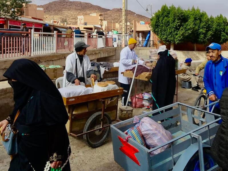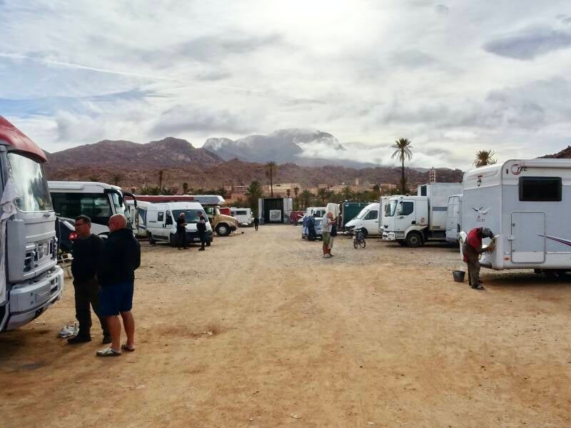 Als we opstaan is het een natte boel buiten: het heeft vannacht geregend. En om ons heen zitten erg donkere, dreigende wolken. Maar het waait hard waardoor die wolken de bergen over geblazen worden. Wat overblijft is erg veel sluierbewolking en dus die harde, koude wind. Al vroeg in de ochtend gaan we naar de hamam. Het is vrijdag tenslotte en we willen okselfris terug zijn bij de camper voordat de jongens van de koranschool met hun gezongen gebeden beginnen. Elke vrijdag een vast ritueel. Ondertussen is duidelijk geworden dat het stroomprobleem van Jan en Pieta, waar we gisteren al over berichtten, veroorzaakt wordt door een verkeerd gemonteerd zonnepaneel. Gelukkig doen de andere twee panelen wel hun best om de accu op te laden. Voor in de middag gaan we met Arjan uit eten. Deze keer bij Chez Nadia. Vanwege de harde, koude wind, deze keer binnen. En het is net of daardoor het eten wat minder smaakt. Je moet er eigenlijk bij stalend mooi weer op het dakterras eten. Dan is het gezelliger en smaakt het eten ook beter. Zo langzaam maar zeker begint het verblijf hier op een reünie te lijken. Een paar dagen geleden kwamen we Rob (van Wil) al tegen, gisteren zijn Thole en Everdien hier aangekomen, en vandaag Anne en Nel. Waarmee we er nog niet zijn, want Gerrie en Annie zijn nog onderweg. Maar met zo’n achthonderd kilometer per dag gaat dat snel.