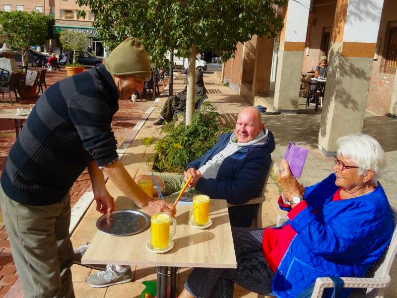 We gaan opnieuw vroeg naar het dorp, weer met twee telefoons en een goed gevulde portemonnaie. We komen terecht in het winkeltje van “onze” telefoonman. We komen er al jaren, vooral voor het opwaarderen van de internettegoeden. Vroeger gebeurde dat met een kaartje waar een nummer tevoorschijn gekrast moest worden. Nu werkt de man met twee eigen telefoons. De simkaart gaat van de ene naar de andere om vervolgens opgewaardeerd en wel in één van onze telefoons te belanden. Vervolgens tovert hij een scherm te voorschijn waarop het nieuwe tegoed staat en de vervaldatum. Of we dat even willen controleren. Hij heeft een goede naam hier en wil absoluut niet dat er iemand denkt dat hij de boel belazerd. Je moet even de tijd nemen als je hem wat laat doen, het is een Pietje precies: maar wij hebben een soort klik met hem. Helemaal gerustgesteld dat de beide telefoons weer werken, lopen we nog een rondje dorp. Via onze groenteboer komen we uit bij onze jus man. Lekker in het zonnetje aan de heerlijke jus d’orange. Dure jus overigens: twee euro voor een groot glas, een soort bierpul. Maar puur sinaasappelsap. De buurman is vijftig cent goedkoper. Maar daar zijn de glazen kleiner, krijg je half sap half water en moet er suiker toegevoegd worden vanwege de mindere kwaliteit sinaasappels. Tot zover dit college jus d’orange. In de middag gaan we aan de borrel op het terras van Anne en Nel. Met ook Karel en José, die hier voor in de middag aangekomen zijn. Ook al ervaren Marokko gangers. Tot slot gaan we nog even wat eten bij Restaurant Harbaz. Een min of meer snelle hap omdat we nog wat van het schaatsen willen zien. Ook wat dat betreft was het een geslaagde dag.