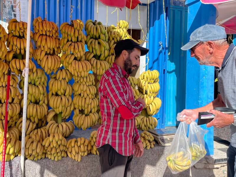 Onze laatste dag in Aourir; althans voorlopig. Wellicht dat we hier op de terugweg nog een keer terecht komen. In de ochtend gaan we boodschappen doen in het dorp. Een zondagochtend in Aourir en daar merk je helemaal niets van. Alles is open en het is er even druk als op andere dagen. Wij gaan voor de groente en het fruit. Maar de kwaliteit valt wat tegen vandaag. Voor mooie, verse spullen moet je toch echt op de markt op de woensdag zijn. Een uitzondering daarop zijn bananen. Er zitten hier wat zaakjes die enkel bananen verkopen. Kleintjes als je ze vergelijkt met die bij ons in Nederland verkocht worden. Maar ze zijn een keer zo lekker. Bij de verkoper een tros aanwijzen en aangeven voor hoeveel gewicht je wilt hebben: de man snijdt dan meestal precies de juiste hoeveelheid bananen af. Bananen die overigens op veel plaatsen hier langs de kust verbouwd worden. Vandaag geen bijeenkomsten om iets te vieren. Daar hebben we ook geen tijd voor: er moet ingepakt worden. Morgenvroeg vertrekken we om half tien naar Tafraout. Met een tussenstop bij de Carrefour. Speciaal voor producten die enkel bij dergelijke grote supermarkten te krijgen zijn. We reizen samen met Jan en Pieta, dus moet het helemaal goed komen. We hebben er zin in!