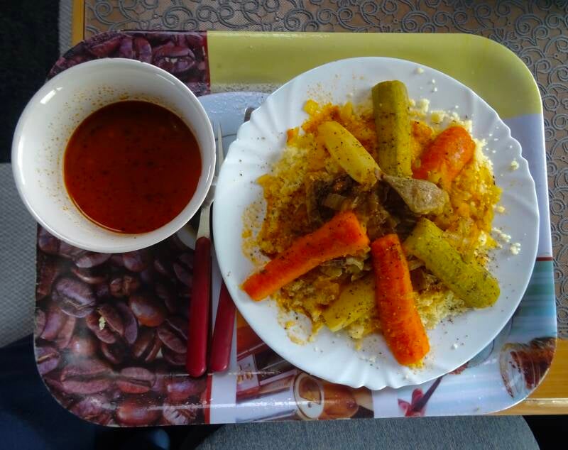 Een bord couscous met saus van het campingrestaurant