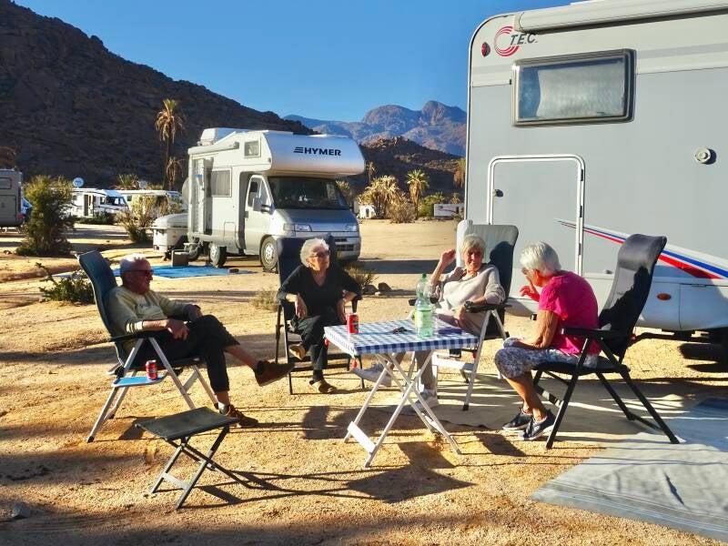 Op de planning voor vandaag stond een fietstochtje naar het dorp voor wat boodschappen. Als we opstaan zien we een flauw zonnetje, maar al snel begint het te regenen. En dat gaat de hele ochtend door. Door schade en schande wijs geworden weten we dat als de straten nat zijn, je niet op de fiets naar Aourir moet gaan. Je weet dan zeker dat je onder de bruine smurrie weer thuis komt. Rond het middaguur wordt het gelukkig droog, maar het blijft fris. In de loop van de middag komt de nieuwe camper van Myran en Peter, van Endless on Wheels, de camping oprijden. Zij reizen op dit moment met een groep door Marokko. Elke vrijdagmiddag verschijnt er een vlog met de belevenissen van de afgelopen week. Een paar jaar geleden zaten wij in de rubriek “Gluren bij de buren”. Het weerzien is weer allerhartelijkst en we hebben weer lekker bij zitten kletsen. En Peter heeft heerlijke koffie. Tegen vier uur is het weer tijd voor een bijeenkomst. André, de buurman van een paar campers verder, is vandaag 81 jaar geworden: en dat moet gevierd worden. Met een drankje en heerlijke hapjes van zijn vrouw Mieke, wordt het natuurlijk weer een gezellige boel. En dat alles kan gelukkig buiten deze keer, maar dan wel met warme vesten aan.