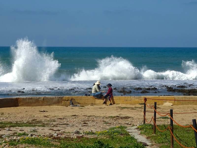 Onze tweede dag op Camping L’Ocean Bleu en tevens de laatste dag. Na de commotie van gistermiddag maken we er een soort rustdag van. Met de patiënt gaat het goed overigens: die heeft nergens last van en de wondjes lijken goed te genezen. In de ochtend wandelen we naar de Carrefour hier in de buurt. Die is gewoon de hele dag open en er is natuurlijk van alles te koop. Wel zo handig in deze ramadan tijd, want verder is alles gesloten in deze omgeving. Na de middag lopen we nog maar eens de andere kant op langs de zee. Ook daar lopen honden, maar een boze blik van Wim is voldoende om ze uit de buurt te houden. Vanuit de camping loopt er een aardige boulevard waar een aantal mobiele koffie- en snackwagens staan. Nu dus allemaal met gesloten luiken. Het strand verderop biedt een trieste aanblik. Ooit hebben daar fraaie bouwwerken gestaan, bedoeld om grote aantallen strand- en badgasten te vermaken. Zo zijn de restanten van een natuurzwembad op het strand nog herkenbaar. Het hele gebied ademt de sfeer van vergane glorie en het verval is al jaren gaande. En dat lijkt nooit meer goed te komen. Wat het weer betreft was het vandaag weer een prima dag met veel zon en zo af en toe wat bewolking. Behalve dan vroeg in de avond als het begint te spetteren. En het was al weer even geleden dat het voorraam van de camper nat geweest is. Morgenvroeg naar de laatste stop in Marokko.